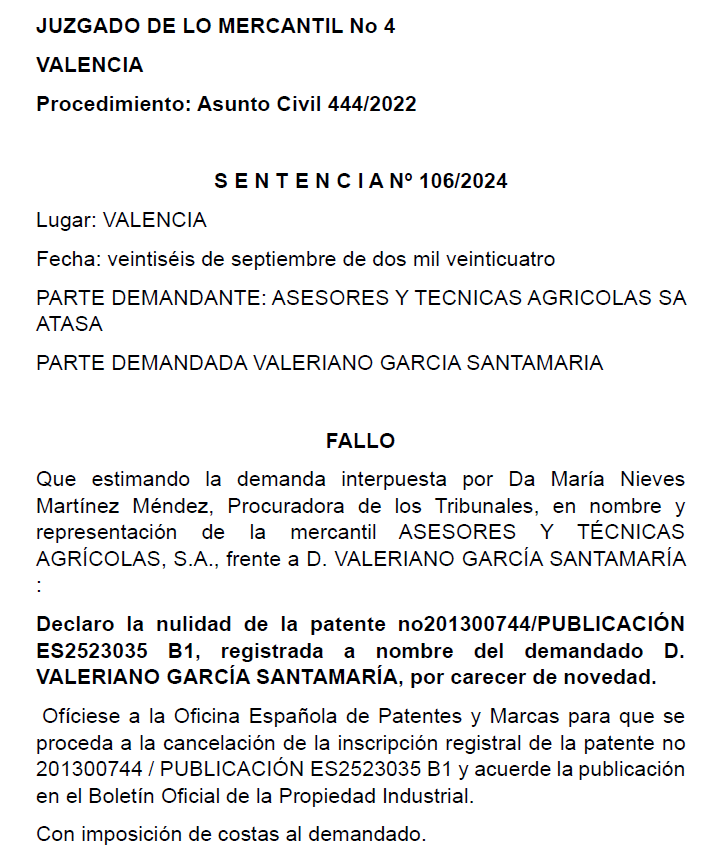 Declaro la nulidad de la patente no201300744/PUBLICACIÓN ES2523035 B1, registrada a nombre del demandado D. VALERIANO GARCÍA SANTAMARÍA, por carecer de novedad.